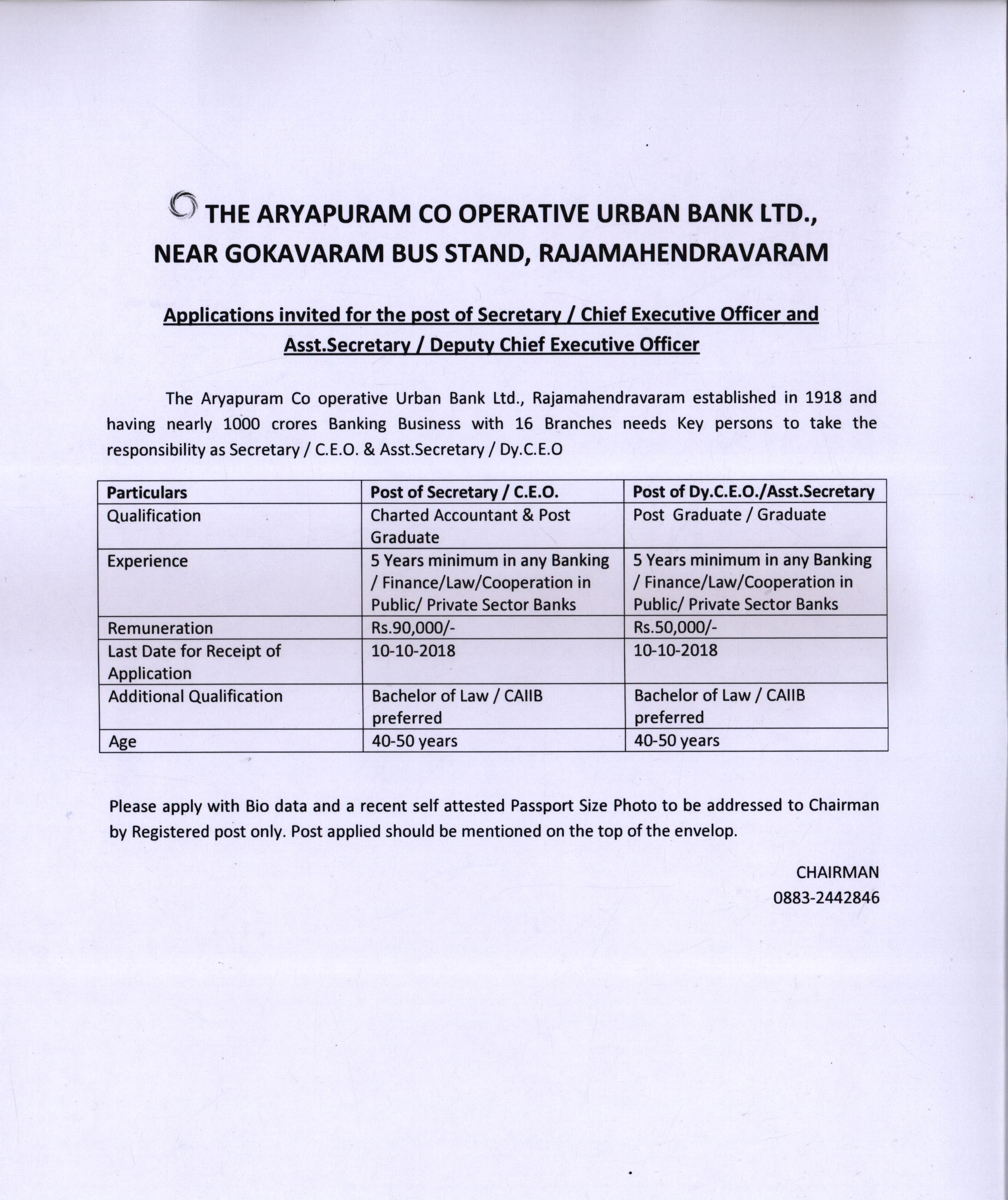 Recruitment Notification for Secretary / CEO and Asst. Secretary / Dy CEO 2018:Interested Candidates Should send their Bio Data by Register Post to :The Chairman, The Aryapuram Co Operative Urban Bank Ltd.,Near Gokavaram Bus Stand, Rajamahendravaram.